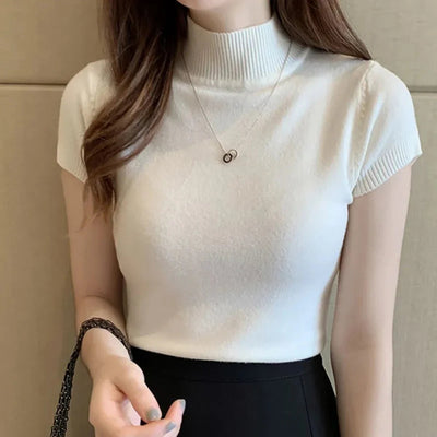 Womens Slim Fit Turtle Neck Short Sleeve Knitted Top