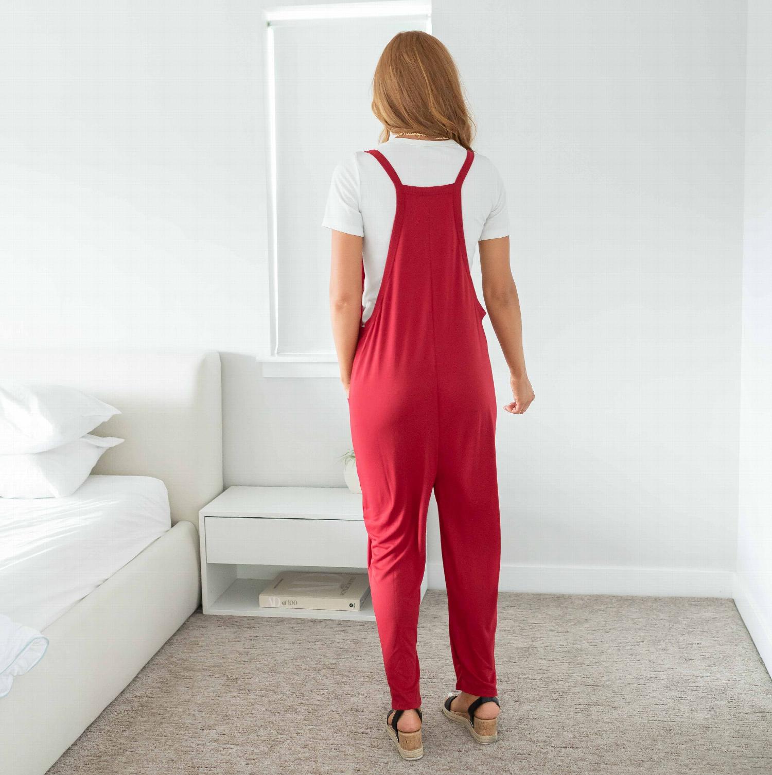This relaxed fit jumpsuit features thin straps with a racerback style. With sides that scoop down to the hips, it has the look of overalls, which creates a slimming effect.