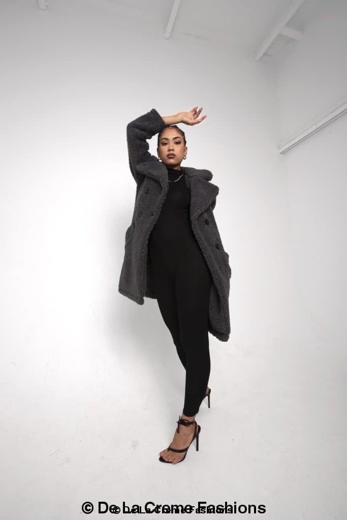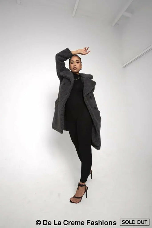 an oversized Double Breasted coat with borg teddy finish.