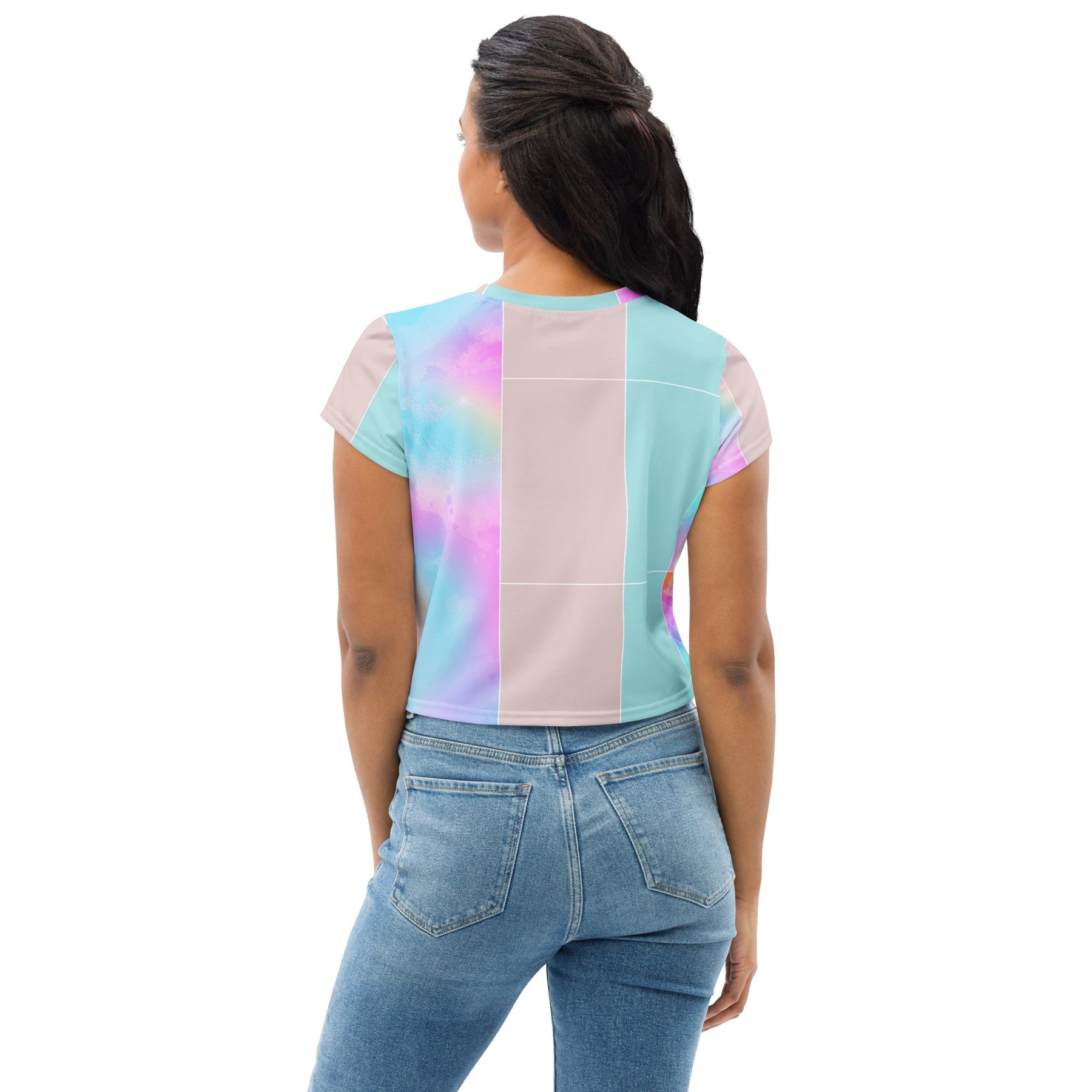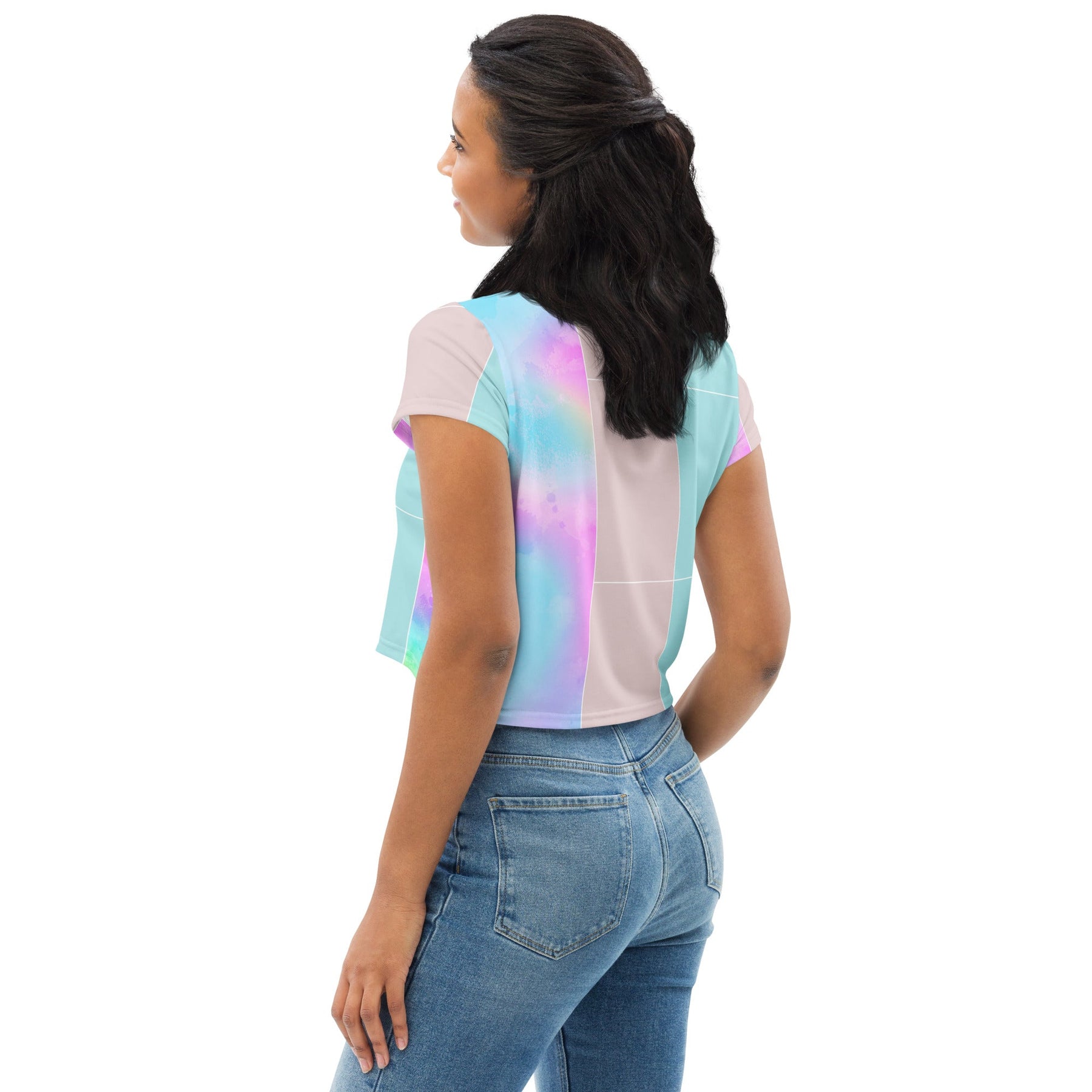 Womens Stretch Fit Crop Tee, Pastel Colorblock Watercolor Illustration. Our women's crop tee jersey offers a delightful blend of comfort and style, perfect for any casual occasion. Crafted from soft, breathable fabric, this chic top features a cropped silhouette that pairs effortlessly with high-waisted bottoms for a trendy look. The crew neckline and short sleeves enhance its laid-back appeal, making it an ideal choice for workouts, outings, or lounging at home. This versatile piece is a must-have addition to your wardrobe, ensuring you stay fashionable and comfortable all day long.